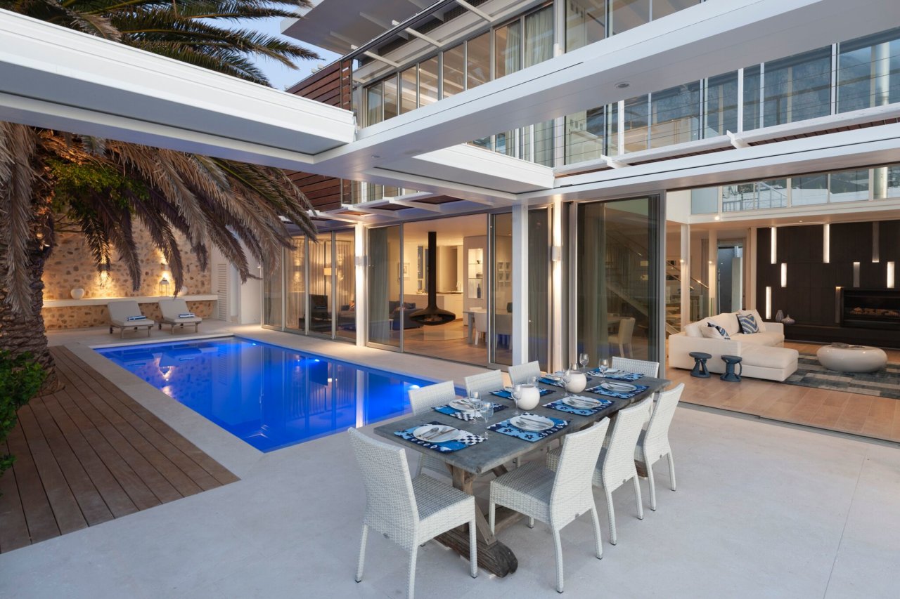 This multi-level villa was conceived by renowned local architect, Bert Pepler and has gained fame in many a glossy interiors publication! If you’re looking for uncompromising quality, privacy and prime position with fabulous views, 2 minutes from the beach, this is it. Located in Camps Bay, its an exclusive and sought-after villa