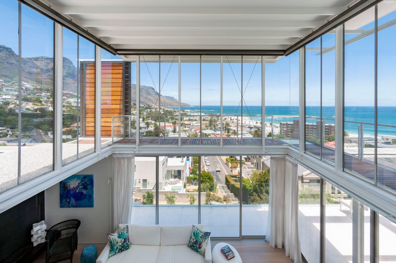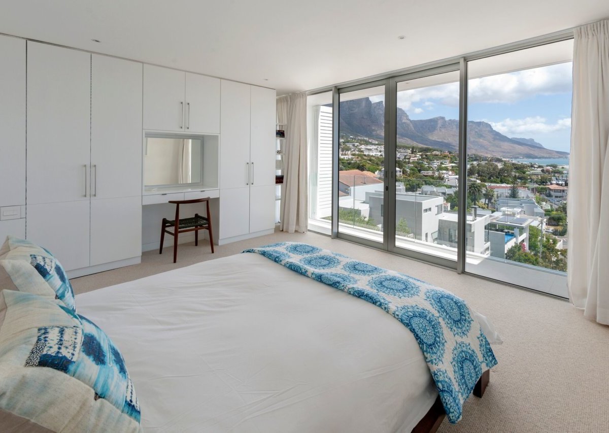 - The main bedroom suite on the upper level overlooks the double volume living area. Glass walls are continuous from bottom to top, affording some of the most outstanding panoramic views. Walk-in cupboard with a bathroom that has mountain and sea views with a warm outdoor shower