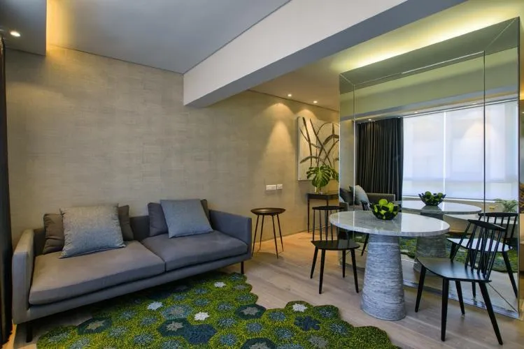 The living room comprises a comfortable 2 seater couch, small marble dining table with 2 vintage Danish dining chairs.