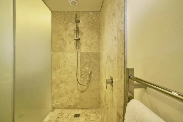 There is a small bathroom with hand wash basin, toilet and hand bidet, heated towel rail and spacious shower. No bath. Pure cotton towels and linen.