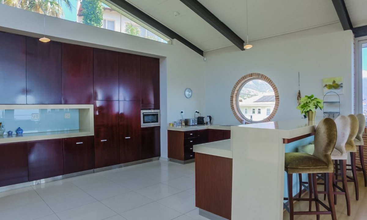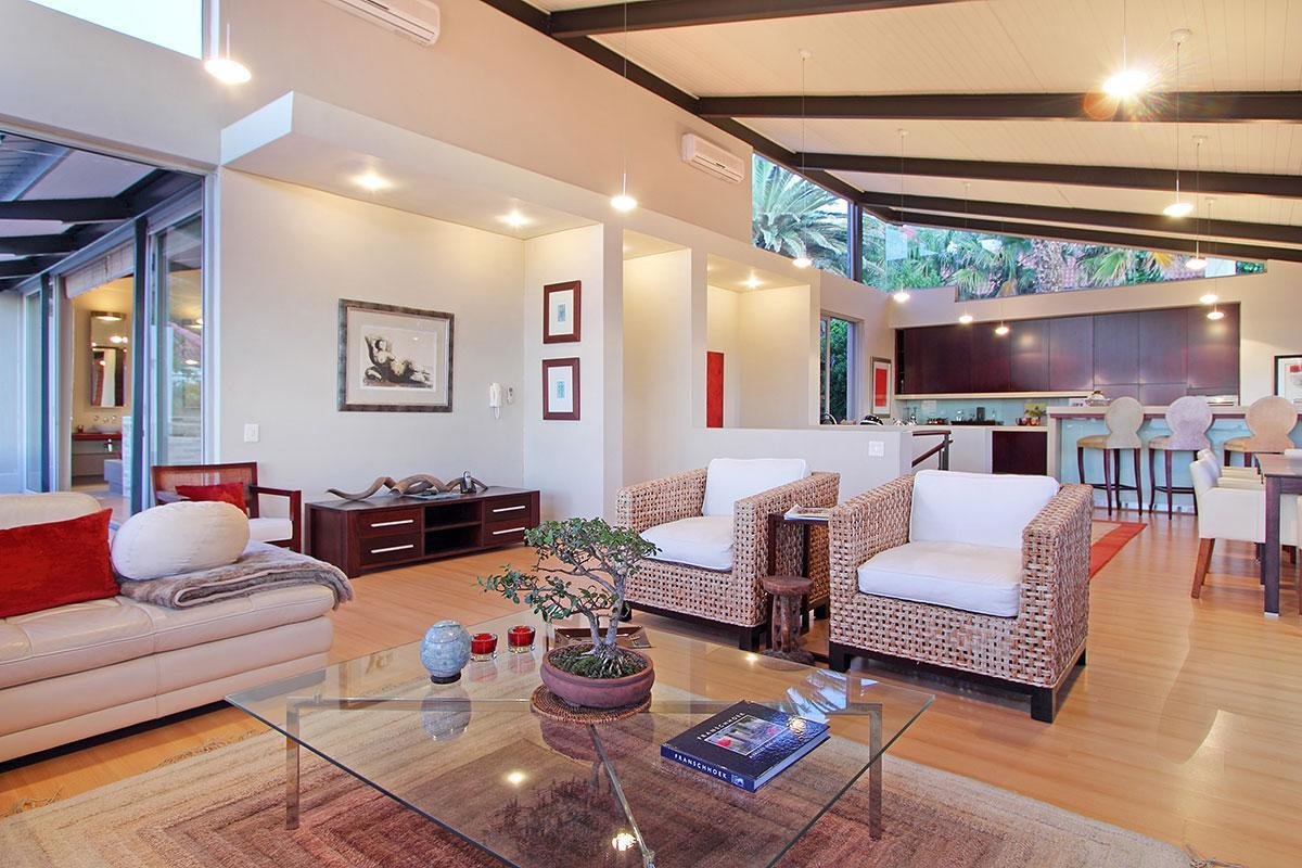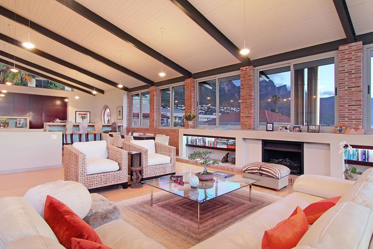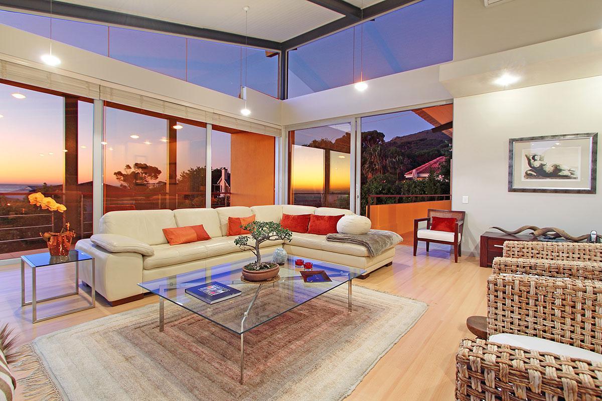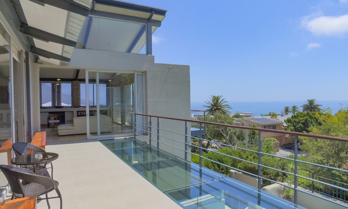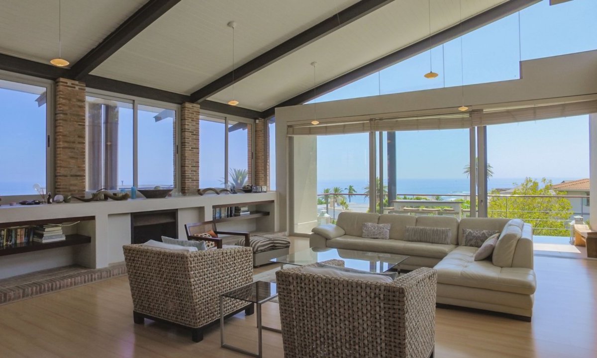 This beautiful home in a premier Camps Bay road achieves rare harmony between a breathtaking setting, quality yet comfortable finishes and a homely ambiance. Set over three floors, it is configured to maximise its dramatic location. The double volume entry hall leads to a TV lounge from which doors open onto a sea-facing balcony. This floor houses a guest toilet and superb guest accommodation of four bedrooms, and beautifully appointed bathrooms with bath and shower. A second open staircase leads from this floor to the striking, open plan living/dining room, kitchen and master bedroom. Expansive windows bathe the entire space in natural light, inviting almost 360o enjoyment of spectacular views of the ocean, the Twelve Apostles and Lion’s Head. A focus on natural materials and a muted colour pallet emphasise the synergy with the environment, and tinted windows allow the sun’s warmth and light to permeate, whilst avoiding its glare. The master suite has a large sea-facing balcony. The luxury bathroom is integrated into the bedroom, with separate WC. This property has numerous balconies, air-conditioning throughout and a double garage. Comfortable, contemporary accommodation, in an unrivaled setting, just five minutes walk from the pristine beach and lively bars and restaurants of this world renowned destination, make this a superb choice for an unforgettable holiday.