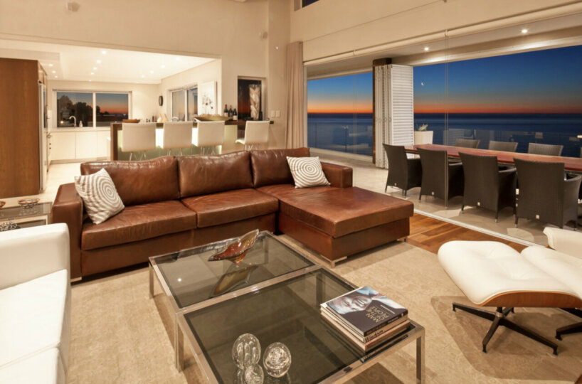 Step into the comfort of two distinct lounges within this spacious dwelling. The upper living area seamlessly blends with a well-equipped kitchen, treating you to expansive 180-degree vistas of Camps Bay's allure. Meanwhile, the lower lounge opens to a balcony featuring a refreshing swimming pool. Both spaces provide cozy couches for relaxation and dining tables accommodating up to 8 guests.