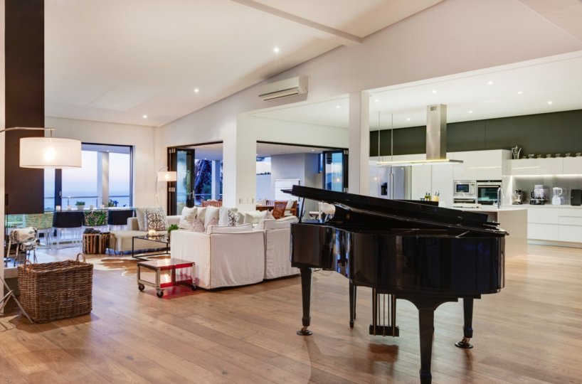 The master bedroom commands breath-taking ocean views with a luxury vi-spring super king size bed, spacious en-suite bathroom with double shower, bath and twin vanities and a private balcony is the perfect place to unwind and soak up the views. The remaining three guest bedrooms have super king-sized beds, en suite bathrooms, air-conditioning, and ample storage space. Each room has beautiful views of Lion’s Head, Table Mountain, or the vast Atlantic Ocean.